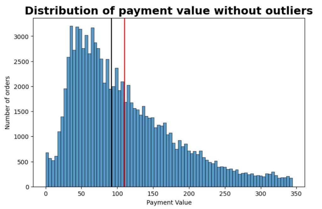 The graph shows the distribution of payment value captured from ‘order_payment’ table. I removed the outliers.