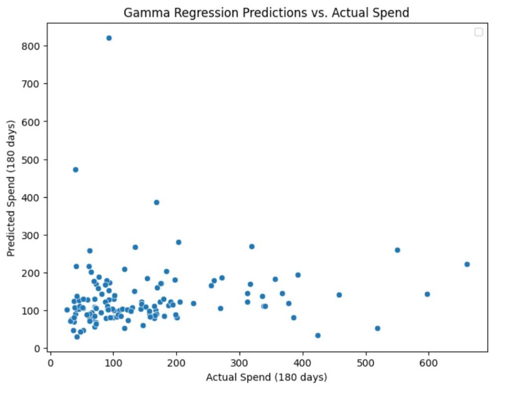 - Gamma Regression handled skewed spend data effectively, making it a suitable choice for continuous positive target variables.