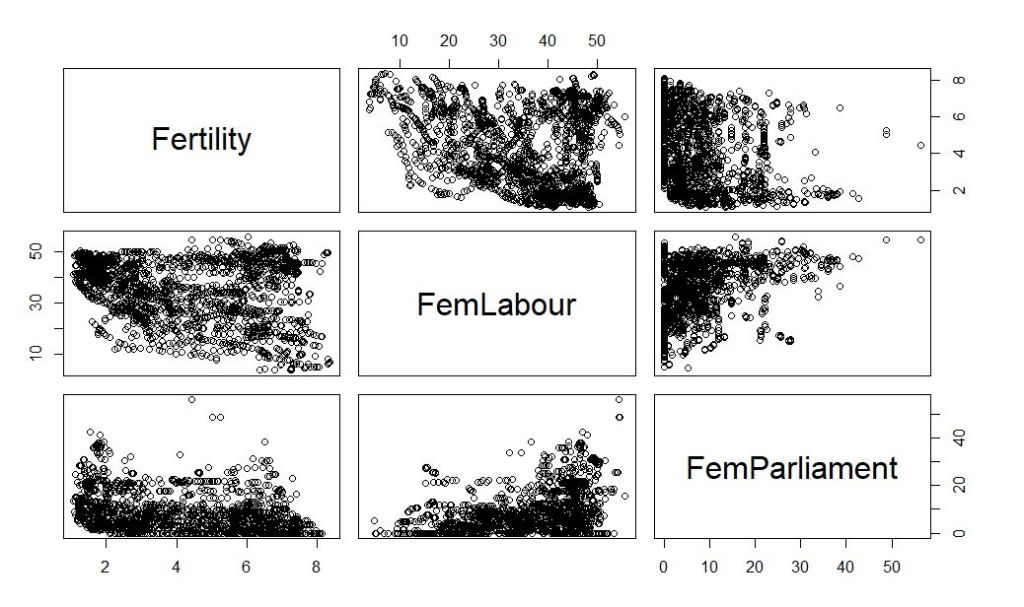 It is observed that Fertility rate and Female proportion in the labour force is not strongly correlated. Neither is Fertility rate and Female proportion in parliament. However, Female proportion in the labour force and parliament is somewhat positively correlated.